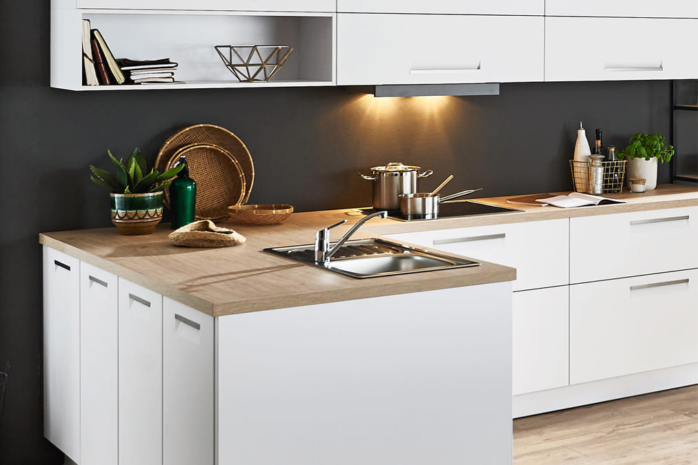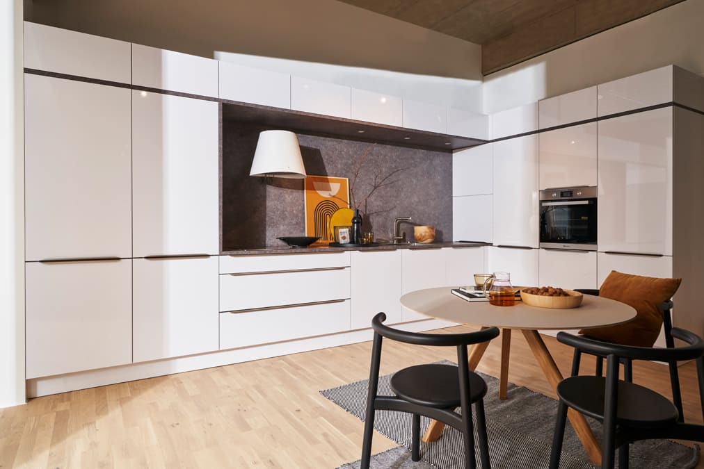 Featured here is Nova Lack in White and curry, a heavenly high-gloss lacquer which you can further liven up with base and wall units and convex doors.